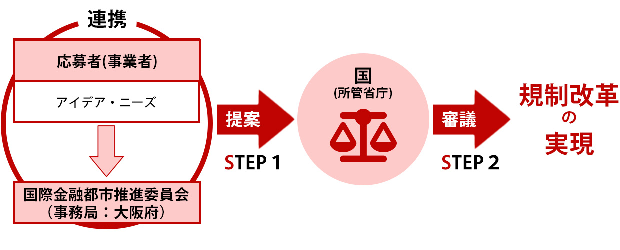 ※応募者等と大阪府市が協働で、国に対して規制改革の提案を行い、国において審議の上、規制改革等を実現